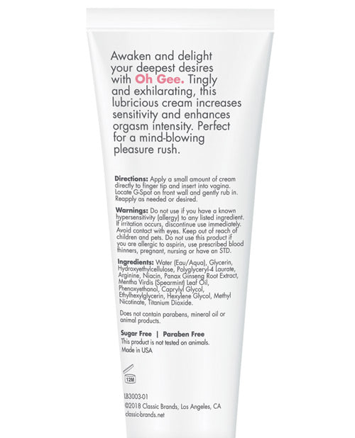 CG's "Oh Gee" G-Spot Gel is formulated to be applied directly to the G-spot to deliver an exhilarating tingly sensation that will truly intensify your pleasure and orgasms. "Oh Gee" G-Spot Gel is fragrance-free, sugar-free, paraben-free, and made in the USA.