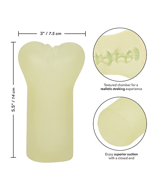 Embrace the excitement and pleasure of Cheap Thrills® with The Phantom Girl masturbator. Its glow-in-the-dark feature, ultra life-like feel, textured chamber, and superior suction combine to create an unforgettable experience.