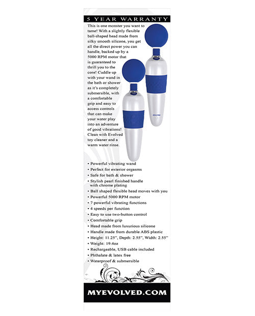 This is one monster you'll want to tame! With a slightly flexible ball-shaped head made from silky smooth silicone, you get all the direct power you can handle, backed up by a 5000 RPM motor that is guaranteed to thrill you to the core! Cuddle up with your wand in the bath or shower as it's completely submersible, with a comfortable grip and easy to access controls that can make your water play into an adventure of good vibrations! Clean with Evolved toy cleaner and a warm water rinse.