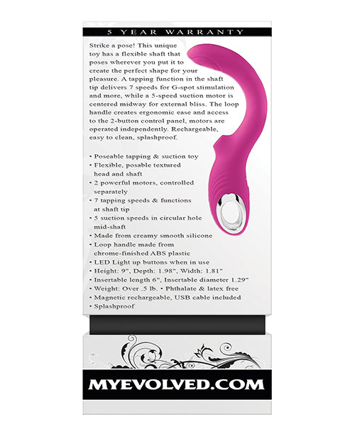 Strike a pose! This unique toy has a flexible shaft that poses wherever you put it to create the perfect shape for your pleasure. A tapping function in the shaft tip delivers 7 speeds for G-spot stimulation and more, while a 5-speed suction motor is centered midway for external bliss. The loop handle creates ergonomic ease and access to the 2-button control panel, motors are operated independently. Rechargeable, easy to clean, splashproof.