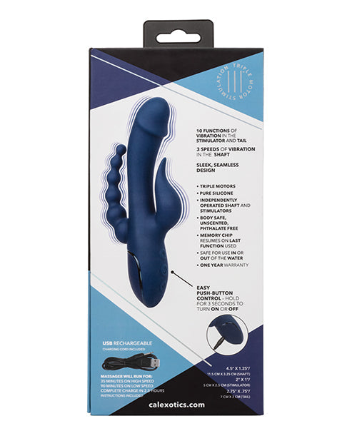 The powerful triple penetrating massager uses 3 speeds of vibration through the sensually curved shaft for g-spot teasing penetration. While a beaded tail thrills and a contoured teaser flickers to the rhythm of 10 powerful independent functions of vibration.
