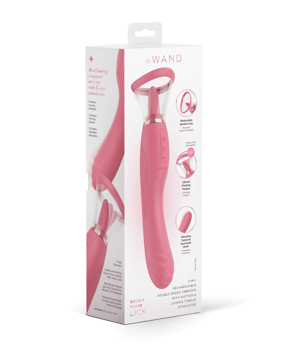 The Le Wand Lick is a 3-in-1 rechargeable double-ended vibrator featuring a sleek handle that serves as a gentle G-spot massager, while the other end includes a silicone tongue with a removable suction cup for tantalizing oral stimulation.
