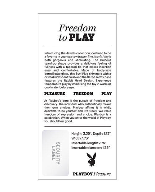 Introducing the Jewels collection, destined to be a favorite in your sex toy drawer. The Jewels Plug is both gorgeous and stimulating. The bulbous teardrop shape provides a delicious feeling of fullness with a tapered tip that makes insertion easy and comfortable. Made of body-safe borosilicate glass, this Butt Plug shimmers with a crystal iridescent finish and the flared safety base features the Rabbit Head Design. Experience temperature play by immersing the toy in warm or cool water before use. Five Year Warranty.