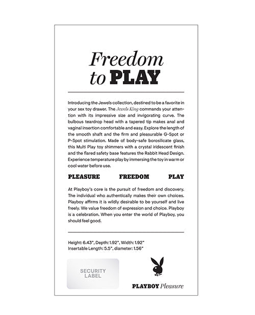 Introducing the Jewels collection, destined to be a favorite in your sex toy drawer. The Jewels King commands your attention with its impressive size and invigorating curve. The bulbous teardrop head with a tapered tip makes anal and vaginal insertion comfortable and easy. Explore the length of the smooth shaft and the firm and pleasurable G-Spot or P-Spot stimulation. Made of body-safe borosilicate glass, this Multi Play toy shimmers with a crystal iridescent finish and the flared safety base features the Rabbit Head Design. Experience temperature play by immersing the toy in warm or cool water before use. Five Year Warranty.