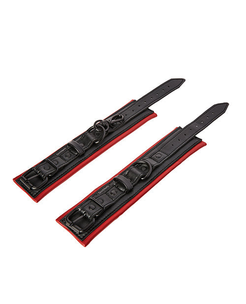 Bright scarlet on darkest midnight vegan leather creates an iconic cuff that will flavor many evenings of debauchery. These heavy-duty wrist restraints have soft inners for a comfortable seduction while you play with power, punishment, and pleasure. Link the cuffs together like a standard set of handcuffs, or separate them and combine with a spreader bar, chains, or other BDSM accessories. These restraints and durable and secure so that you know your plaything is fully captivated.