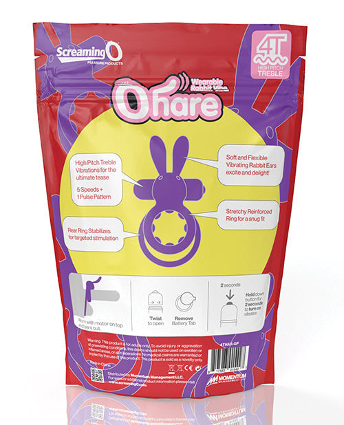 4T Ohare from Screaming O. High Pitch Treble Vibrations for the ultimate tease. 5 speeds plus one pulse pattern bullet. Soft and Flexible Vibrating Rabbit Ears excite and delight. Stretchy reinforced ring for a snug fit. Rear Ring stabilizes for targeted stimulation. Reusable. Waterproof. Greener packaging solution from Screaming O. Re-sealable zip-top and made from eco-friendly, compostable materials. Featuring a new, better battery. New 4LR44 battery provides reliable and long-lasting power. Child-safe. Non-choking hazard.