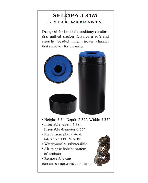Designed for handheld cushiony comfort, this quilted stroker features a soft and stretchy beaded inner stroker channel that removes for cleaning. Five Year Warranty.