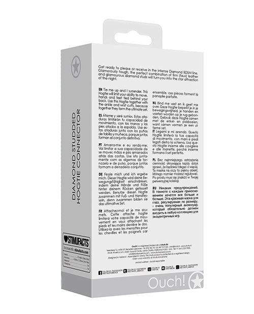 Get ready to please or receive in the intense Diamond BDSM line. Glamorously tough, the perfect combination of firm (faux) leather and glamourous diamond studs will turn you into the star attraction of the night. Tie me up and I surrender. This Hogtie will limit your ability to move, hands and feet tied behind your back. Use this Hogtie together with the ankle and wrist cuffs, because together they form the ultimate set. The perfect addition to a very hot kind of trouble ? it is time to set your dark side free.