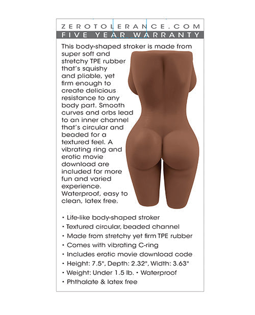 This body-shaped stroker is made from super soft and stretchy TPE rubber that's squishy and pliable, yet firm enough to create delicious resistance to any body part. Smooth curves and orbs lead to an inner channel that's circular and beaded for a textured feel. A vibrating ring and erotic movie download are included for more fun and varied experience. Waterproof, easy to clean, latex free. Five Year Warranty.