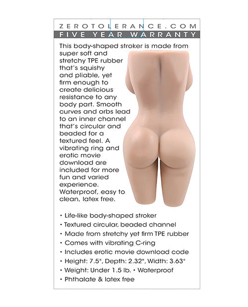 This body-shaped stroker is made from super soft and stretchy TPE rubber that's squishy and pliable, yet firm enough to create delicious resistance to any body part. Smooth curves and orbs lead to an inner channel that's circular and beaded for a textured feel. A vibrating ring and erotic movie download are included for more fun and varied experience. Waterproof, easy to clean, latex free. Five Year Warranty.