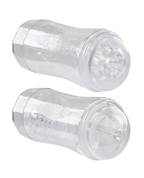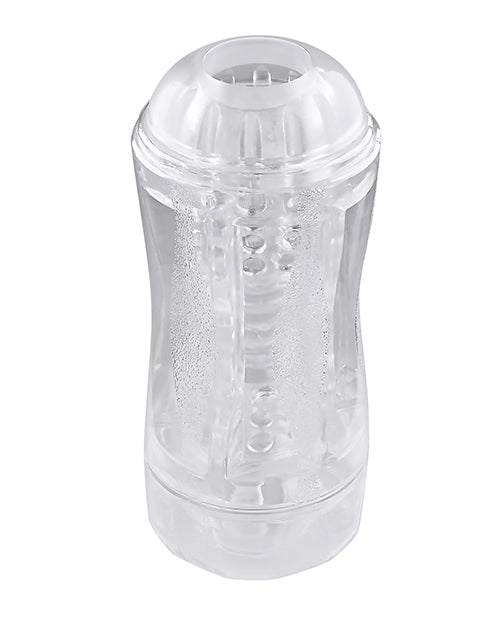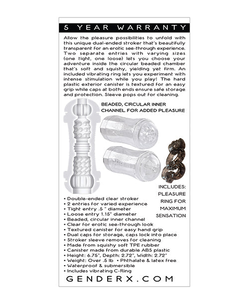Allow the pleasure possibilities to unfold with this unique dual-ended stroker that's beautifully transparent for an erotic see-through experience. Two separate entries with varying sizes (one tight, one loose) lets you choose your adventure inside the circular beaded chamber that's soft and squishy, yielding yet firm. An included vibrating ring lets you experiment with intense stimulation while you play! The hard plastic exterior canister is textured for an easy grip while caps at both ends ensure safe storage and protection. Sleeve pops out for cleaning.